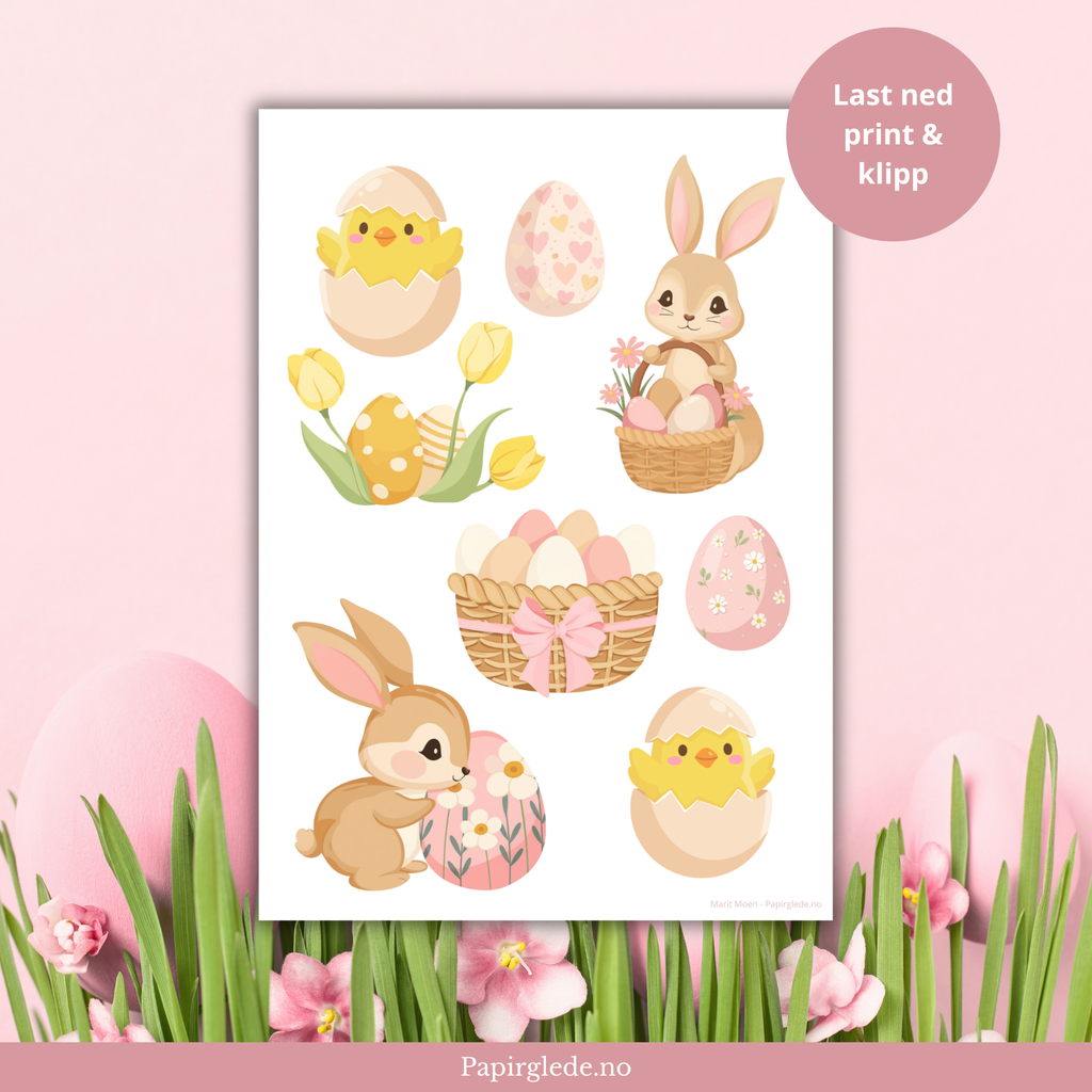 Her er det både påskekyllinger, påskeharer og påskeegg. Motivene er perfekte til både kortlaging, scrapbooking, journaling og annen papirhobby.